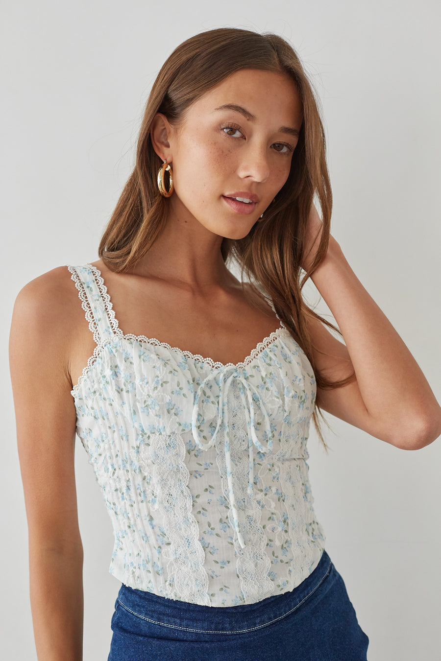 Stay sweet in the Beverly Lace Trim Floral Bustier Corset Top! This features a sexy bustier fit, delicate lace detailing, and flattering lace up back. Available in Blue Floral; style with your go-toto complete the look.
