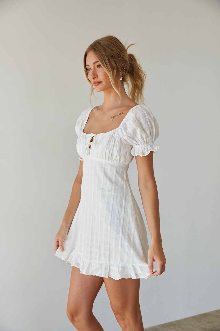 Prepare to blossom in the Clover Puff Sleeve Gingham Mini Dress this Spring Summer! This babydoll mini dress is ready for sunny days and daydreaming; featuring darling puff sleeves, an open back silhouette, tie front bustier detail. Available in white and sage green with a subtle gingham print. Pair this sundress with a pair of to complete the outfit!