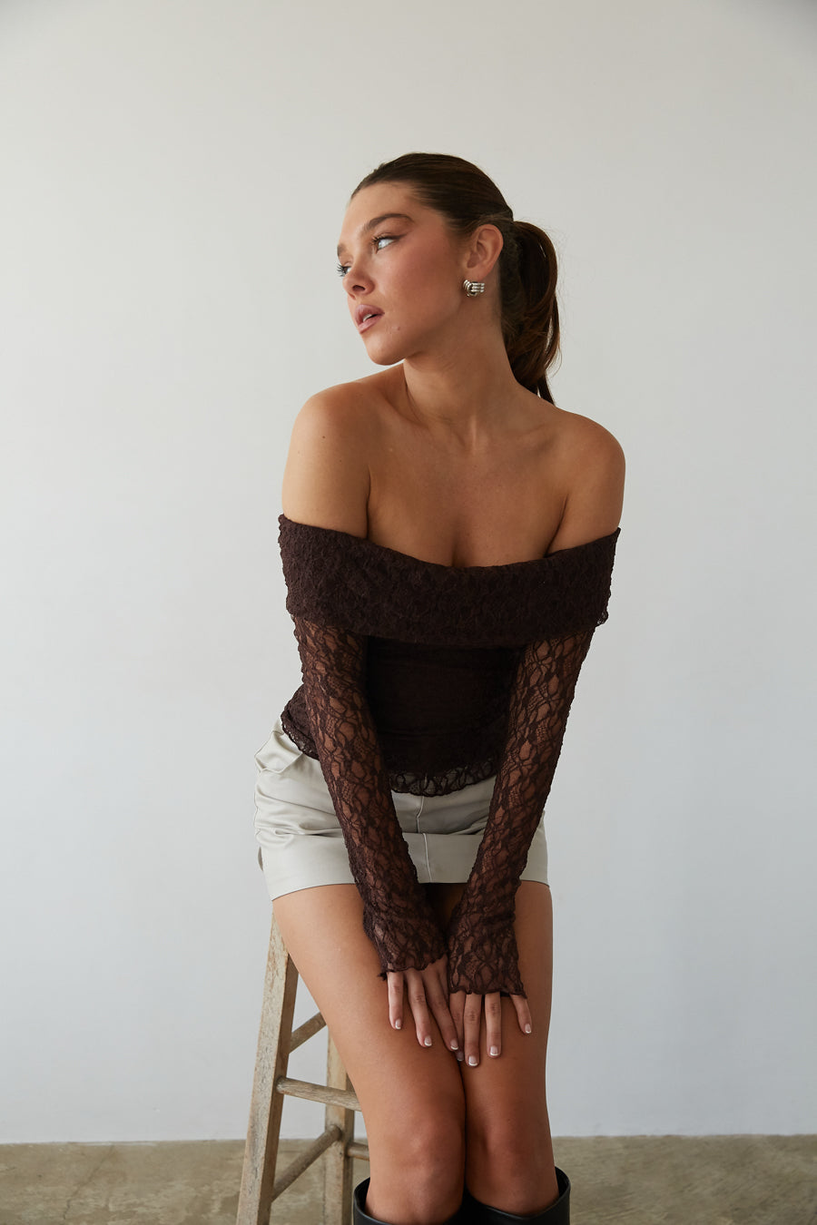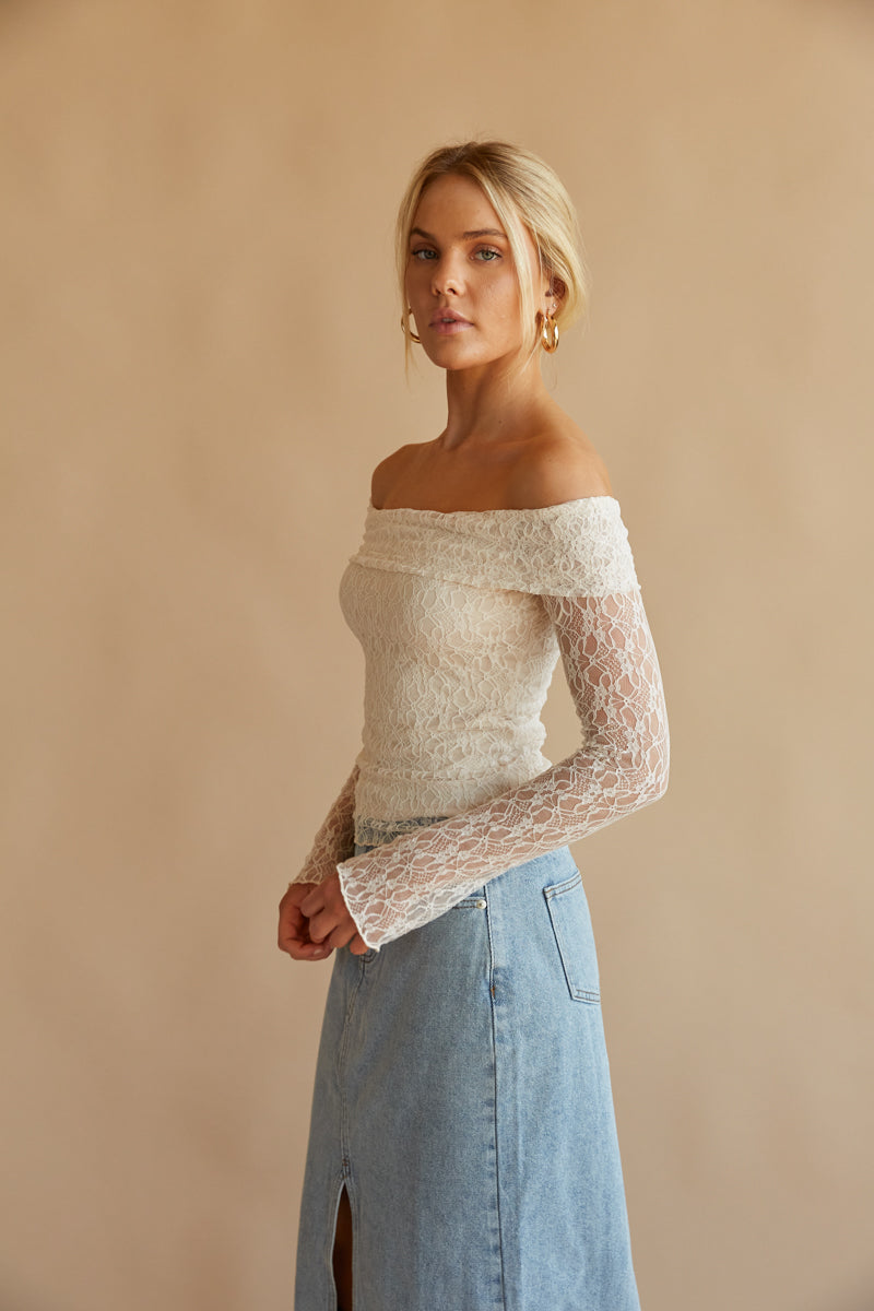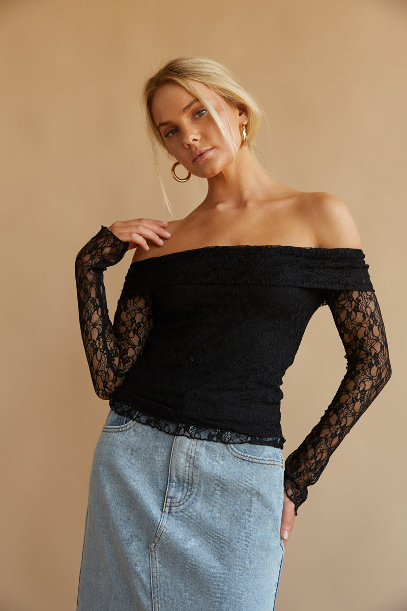 Feel flirty and feminine in the Collette Off The Shoulder Lace Long Sleeve Top! This beautiful top features a fold-over neckline, off-the-shoulder sleeves, and a stunning lace overlay. Available in black, white, and snow. Pair with the to complete the look!