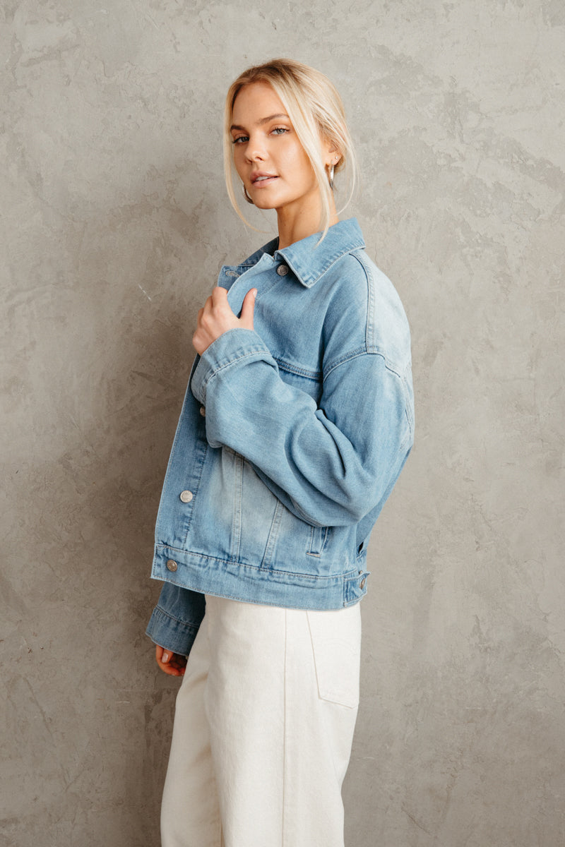 You'll never go out of style in the Daria Denim Jacket! This denim jacket is made of a medium wash denim and features a collared neckline, 92% Cotton, 3% Viscose, 5% Polyester