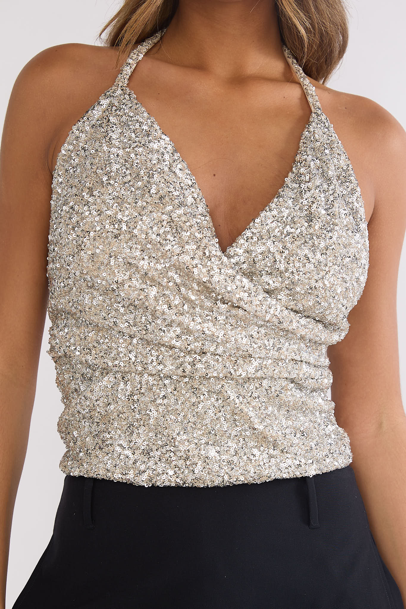 Make them stop and stare in our stunning Just A Spark top. It features sequins throughout and a halter neckline. Perfect for a birthday celebration teamed with a mini skirt and kitten heels for a hot look.