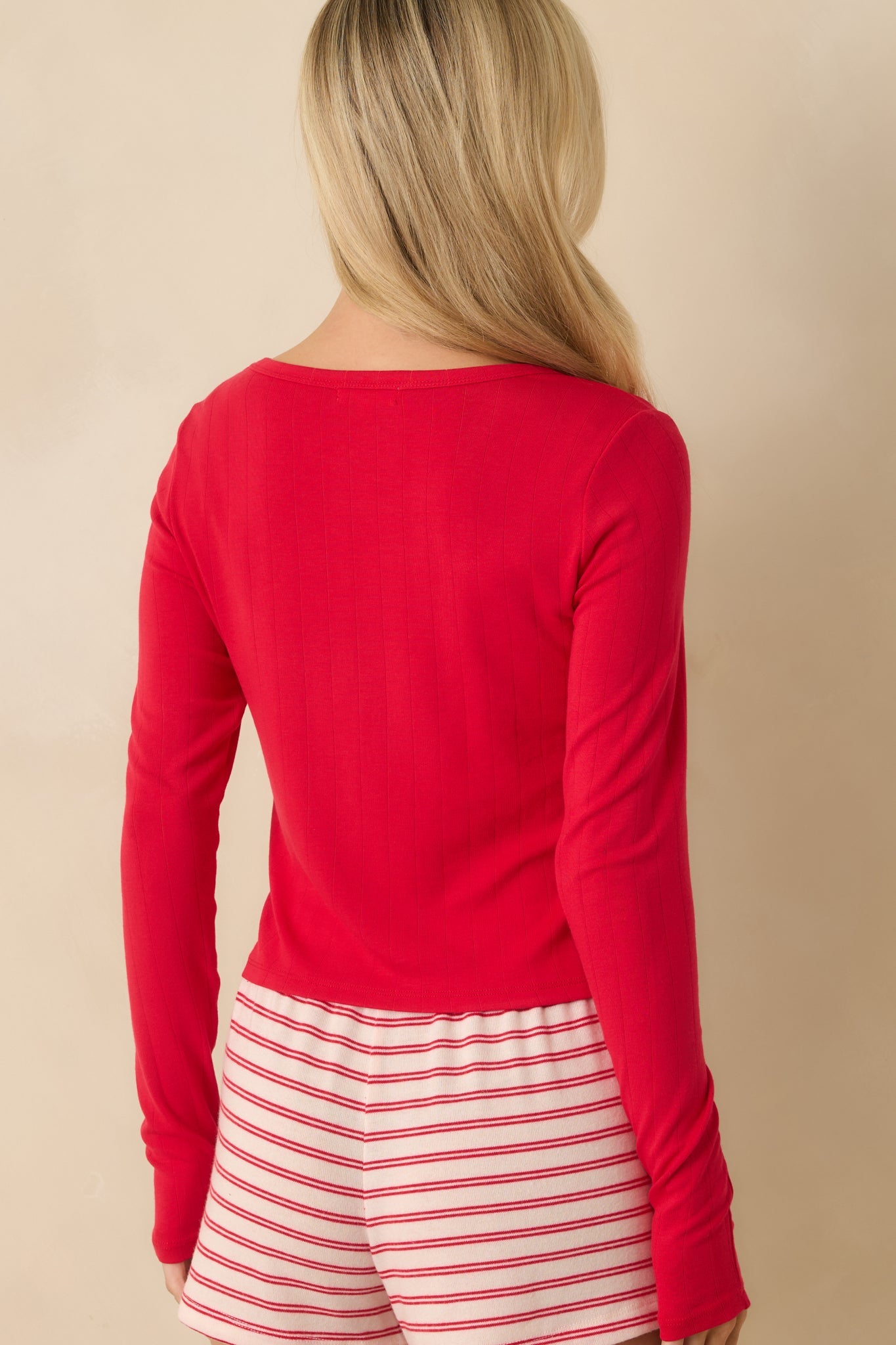 Simple, flattering, and endlessly useful, the Z Supply Kiss Me Red Felt Cute Rib Top is one of those pieces you’ll wonder how you lived without. The soft ribbed fabric hugs just right without feeling tight, making it perfect for layering or wearing on its own. Dress it up, dress it down, or keep it cozy at home—it’s an easy favorite no matter the plan. This red ribbed knit top features a lightweight, stretchy fabric with a subtle vertical rib texture, a classic scoop neckline, and long sleeves. Designed with a fitted silhouette, it offers a comfortable feel that layers easily.